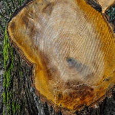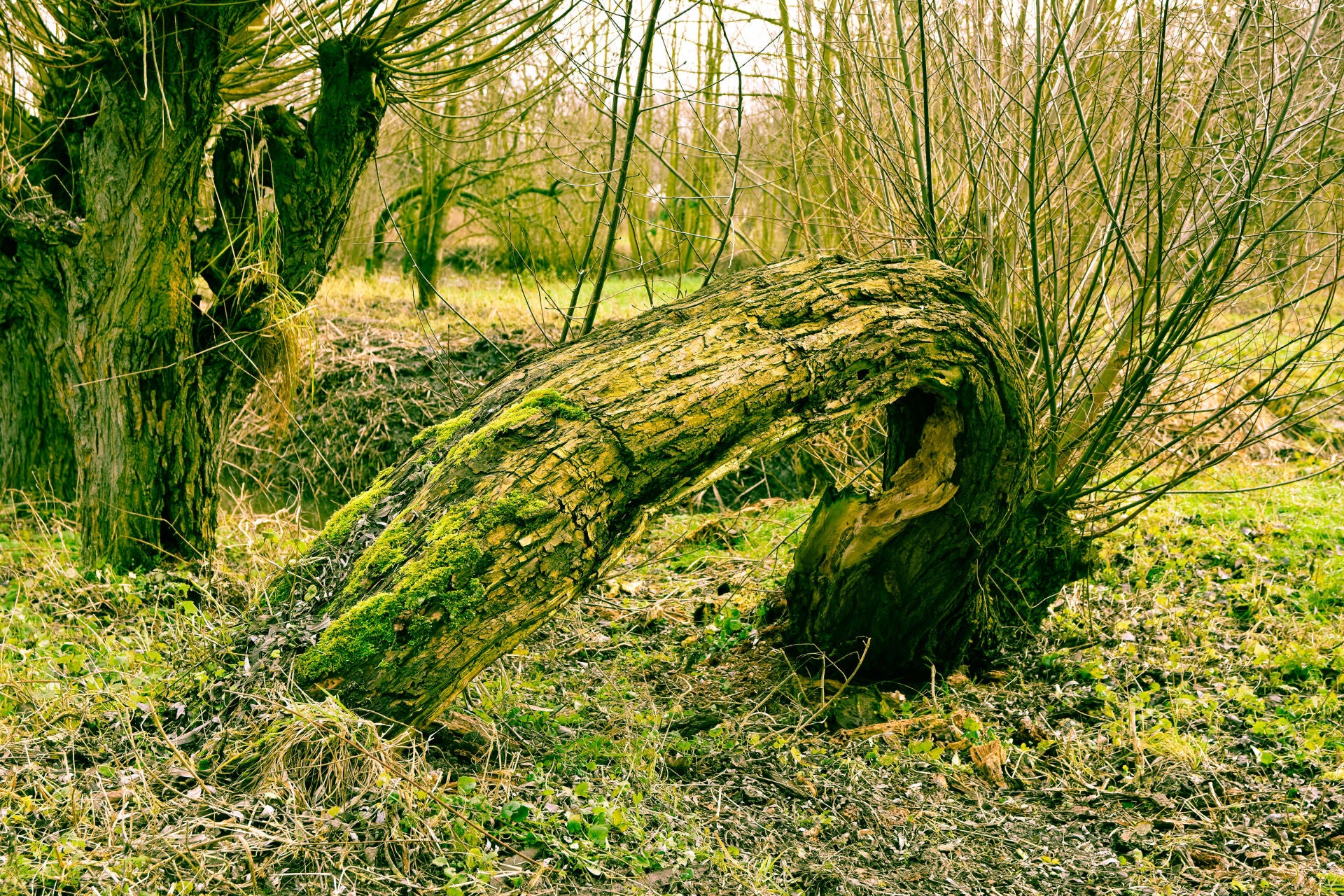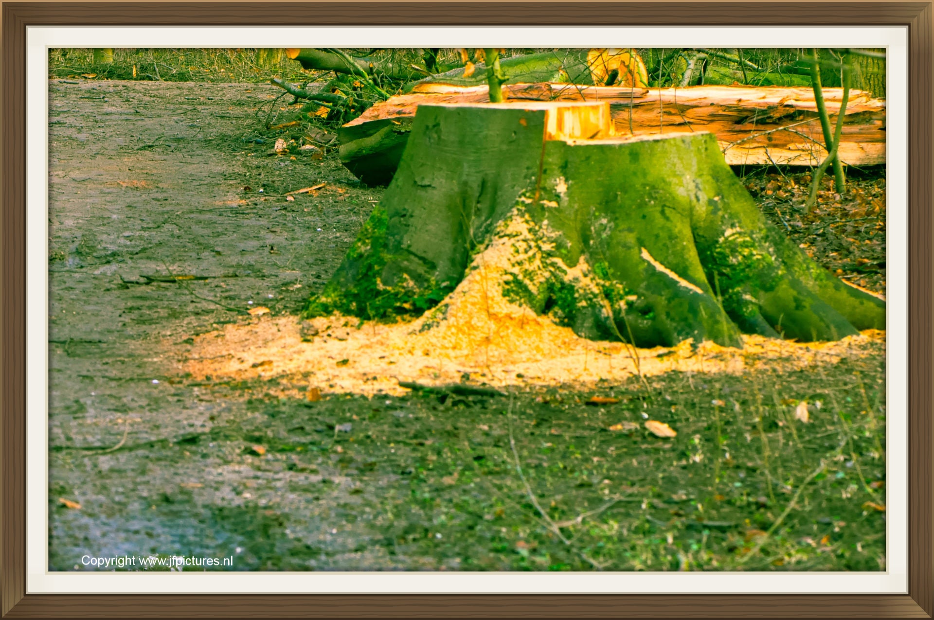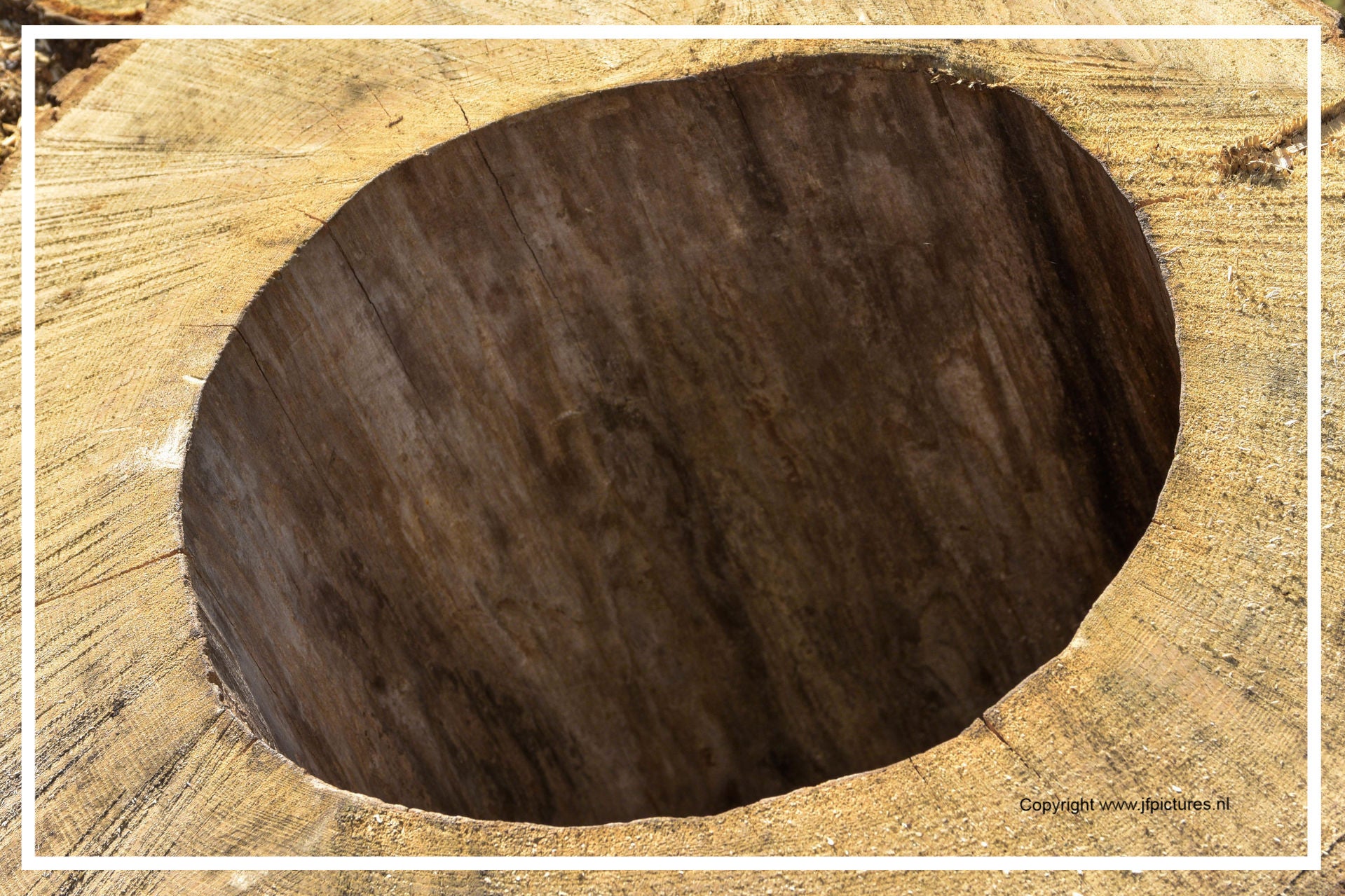 Omgezaagde boom waar de kern uit is verdwenen zonder ingrijpen van de mens