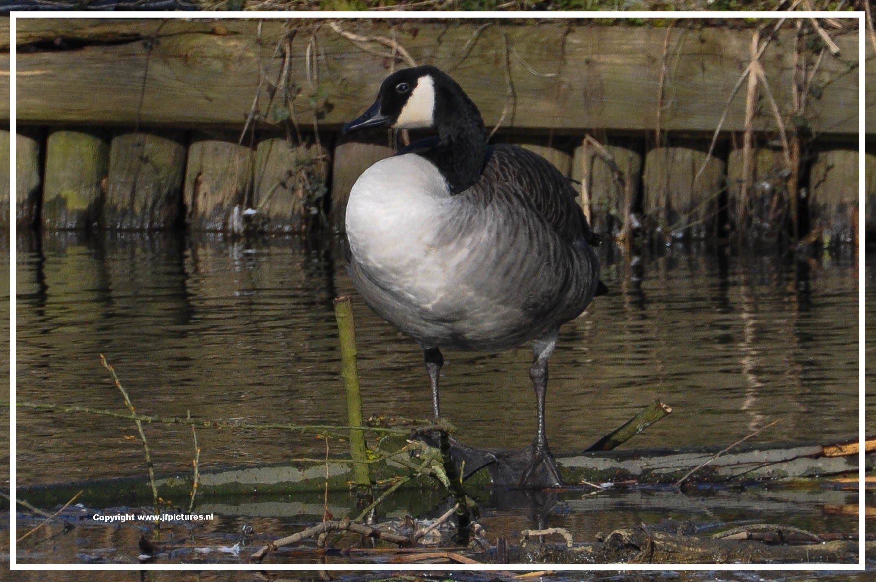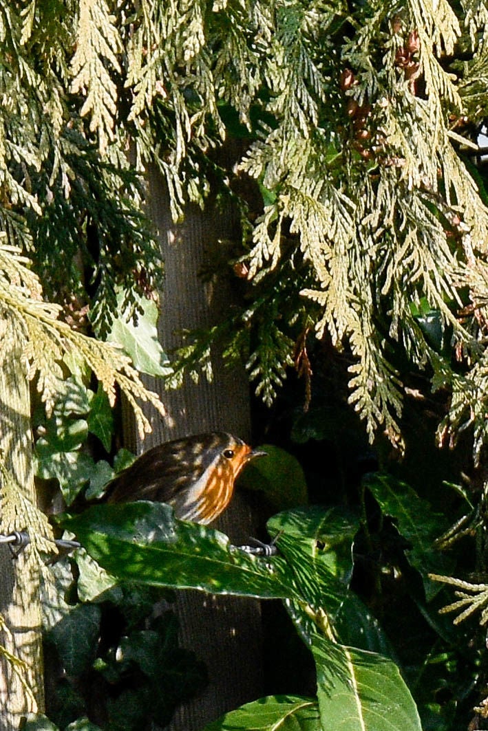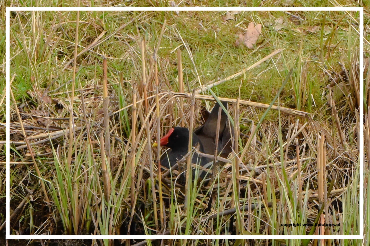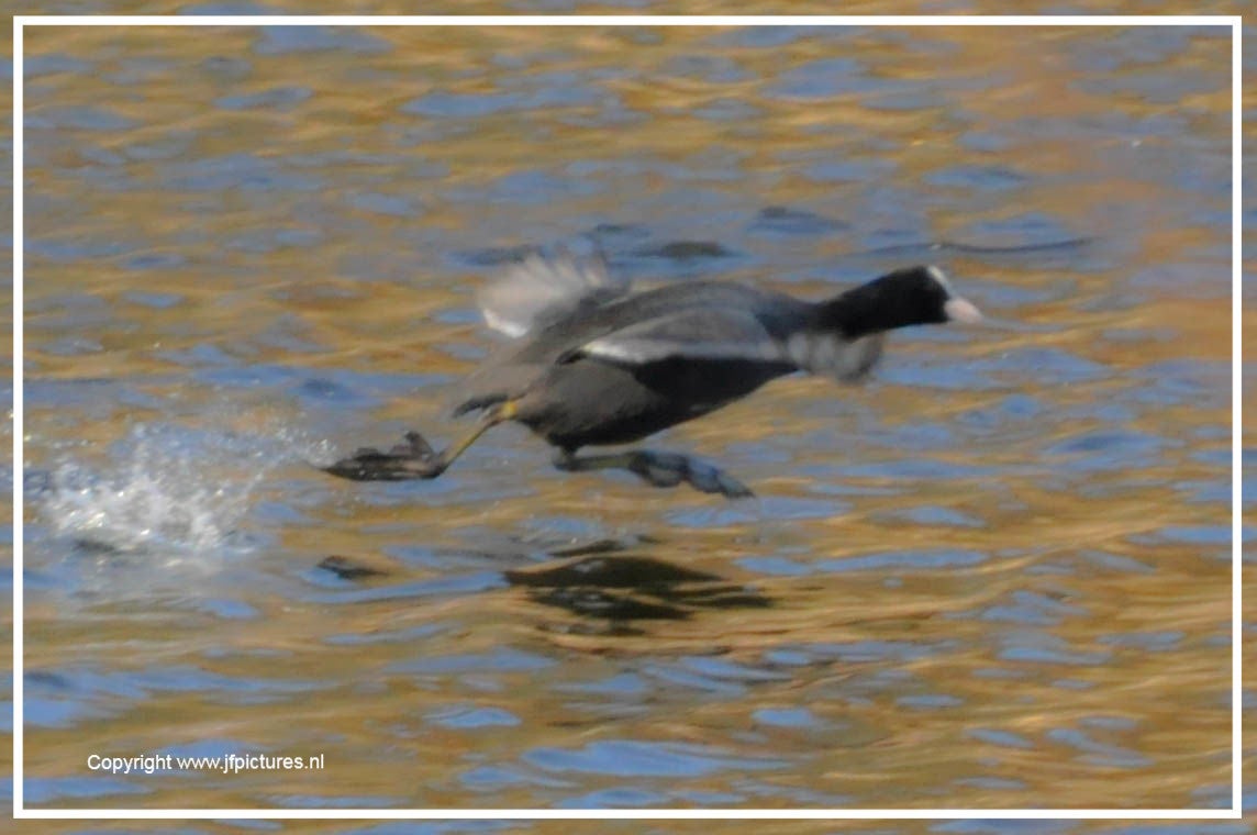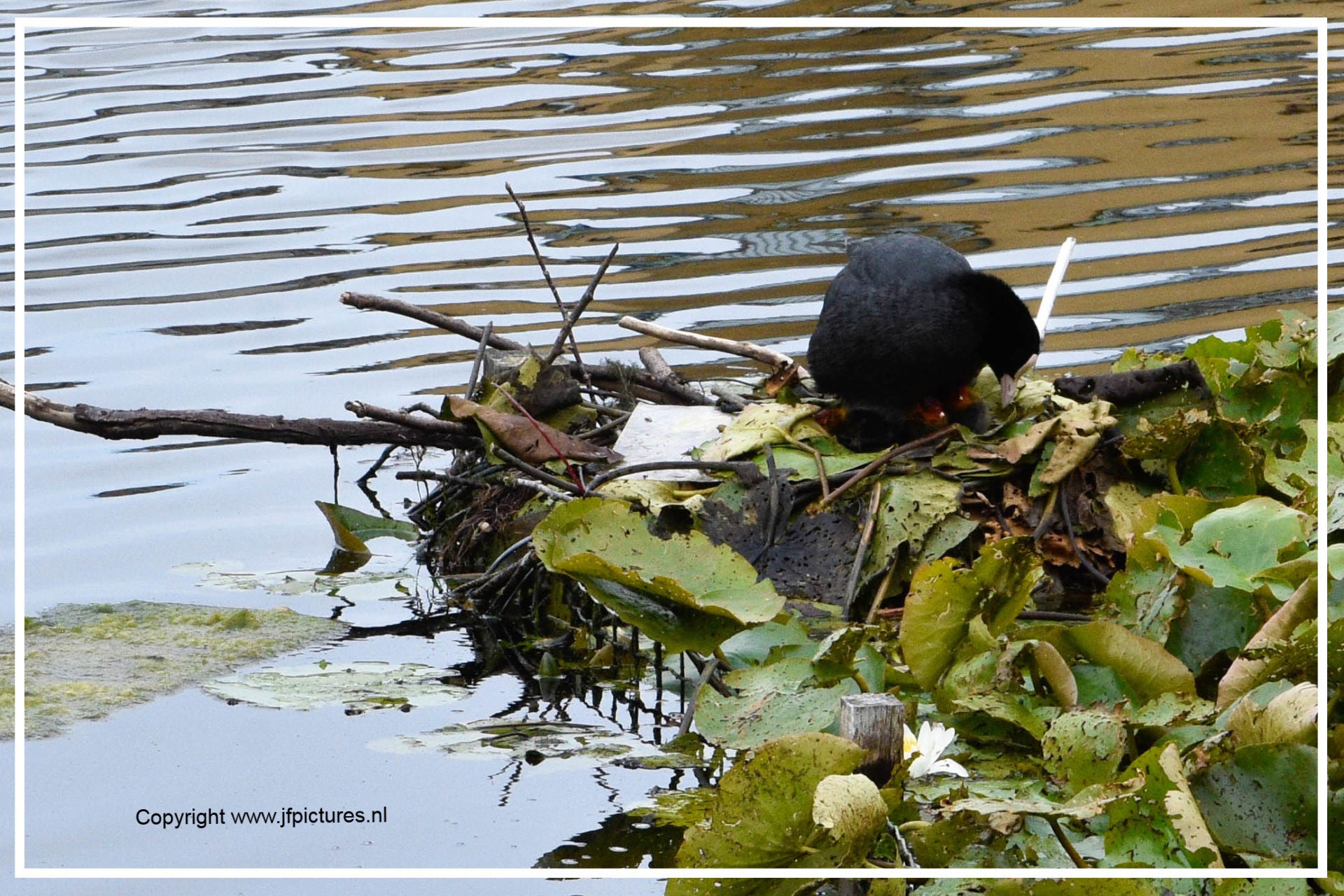 Toch nog even naar buiten. Ontdekt dat de meerkoet toch wel een vreemde nestenbouwer is. Hij / zij sleept grote plompenbladeren naar een wel heel aparte plek. Loopt met het blad via een ketting omhoog, legt het op de steiger en gaat op zoek naar een nieuw blad. Zo ontstaat het nest.
